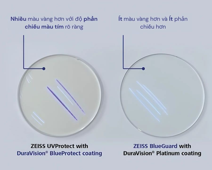 - Thẩm mỹ cao hơn: Nhờ tích hợp công nghệ ngay trong phôi kính, Zeiss Blue Guard giảm đến 50% hiện tượng phản chiếu ánh tím/xanh thường thấy.